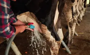 Milk is collected using sanitized equipment under strict hygiene standards. The process is done calmly to ensure animal comfort.